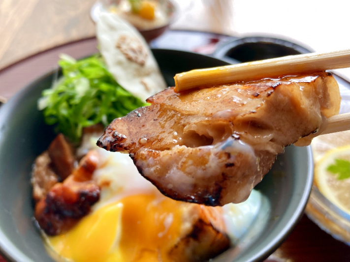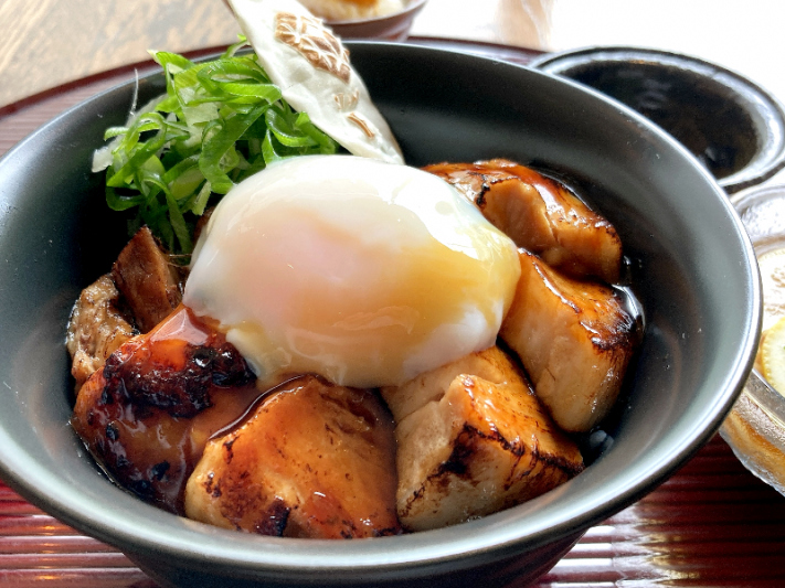 温泉卵をつぶして一緒に食べると、濃厚なチャーシューにまろやかな黄身が絡んで絶品の味に!