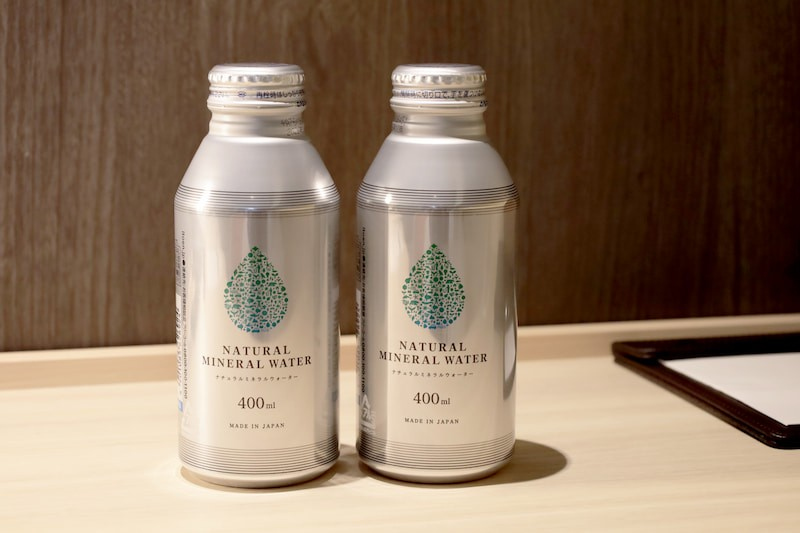 この度、プラスチックごみ削減への取り組みの一環として、客室内のミネラルウォーターをペットボトルから、リサイクル率が高く繰り返し再生できる素材の、アルミボトル缶に切り替えます。