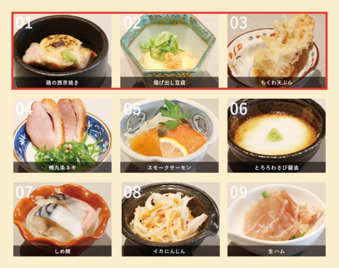 全9種類のおつまみの中から、お好きな3品をお選びいただけます。