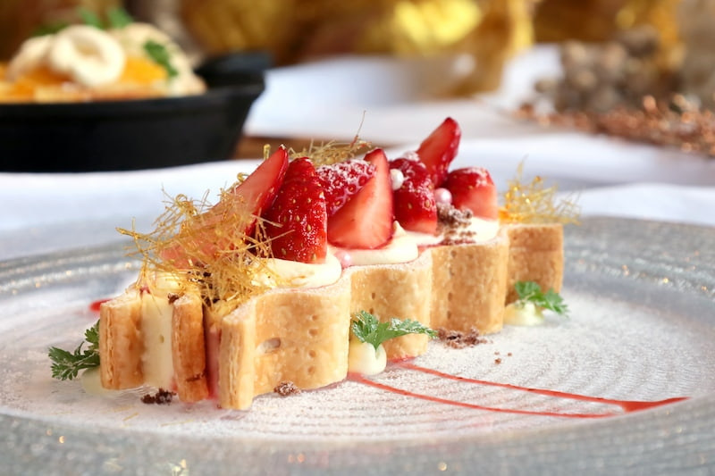 苺のパイとマシュマロチーズケーキを重ねたデザート。マスカルポーネとカスタードの優しい甘さが広がります。