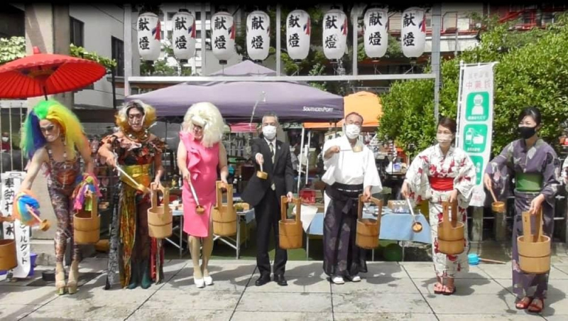 「曽根崎ソーシャルグッド」のキックオフとして、8月6日に、曽根崎で最も有名なスポットのひとつ露天神社(お初天神)の境内でプロジェクトのご紹介と、曽根崎の活性化を願い打ち水を実施しました。お初天神の吉沢宮司から曽根崎の魅力をご紹介いただき、プロジェクト応援サポーターであるドラァグクイーンの ベビー・ヴァギーさん、ドリアン・ロロブリジーダさん、オズさんからは応援メッセージをお話しいただきました。