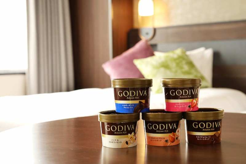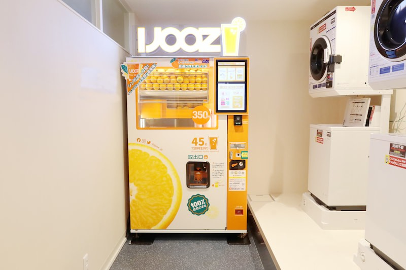 オレンジまるまる4個分を生搾りしたフレッシュなオレンジジュースの自販機や、GODIVAのアイスなどを販売しております。