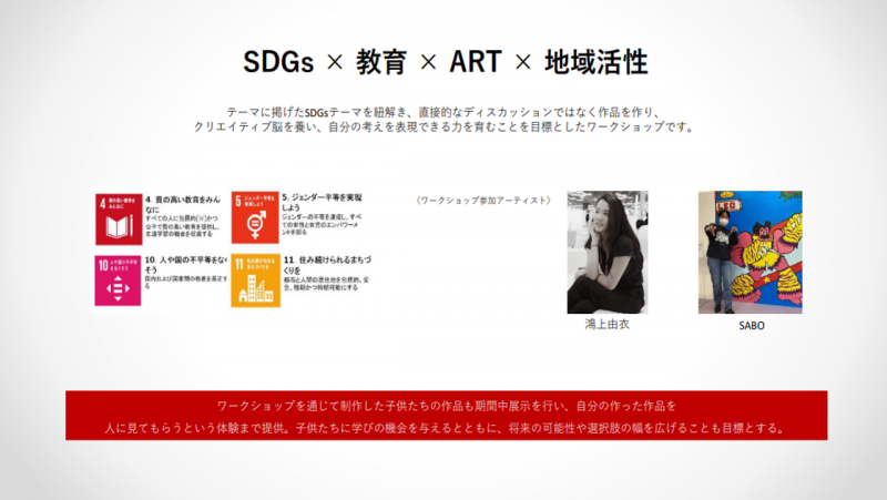 子供達にアートを通して楽しみながらSDGsに触れてもらう、ワークショップを実施いたします。 アーティストがそれぞれの技法を子供たちに伝授しながら、アートを通して持続可能な社会を考えるきっかけを創出します。