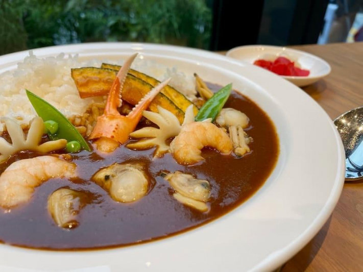 エビやホタテなどの魚介の旨みと、煮込んだ牛すじの甘味が溶け込んだ特製カレーに秋の味覚のかぼちゃを添えたお腹も満足の一品です。