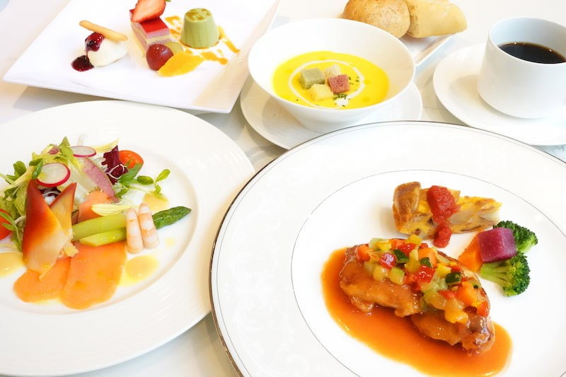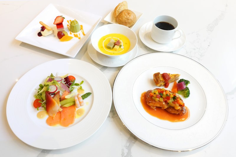 メインは丁寧に焼き上げた若鶏のソテー。彩り豊かな食材とともにお楽しみください。