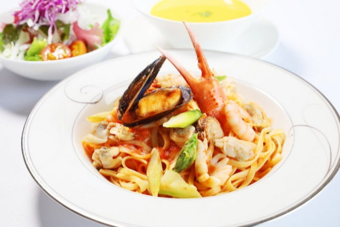 香ばしく焼き上げた旬のとうもろこしと、シェフ特製のオニオンブラックペッパーを使用したオリジナルドレッシングが極細パスタによく絡み合いあっさりしながらも食欲をそそる逸品です。