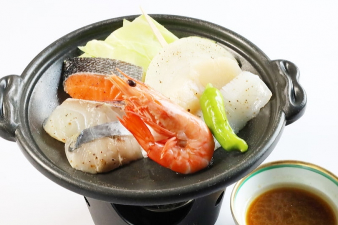 鯛・さごし・天使の海老・帆立などの海鮮と野菜をバターとともに 熱々の陶板で焼き上げ、柚子のきいた醤油ダレで。