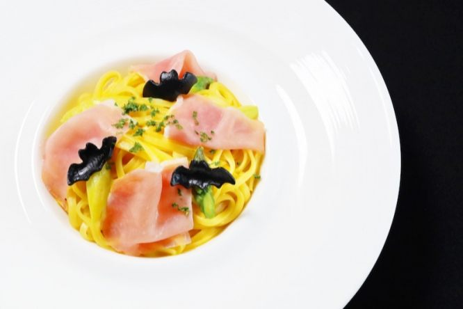 イカ墨を練りこんだ自家製パスタのコウモリで可愛く演出!