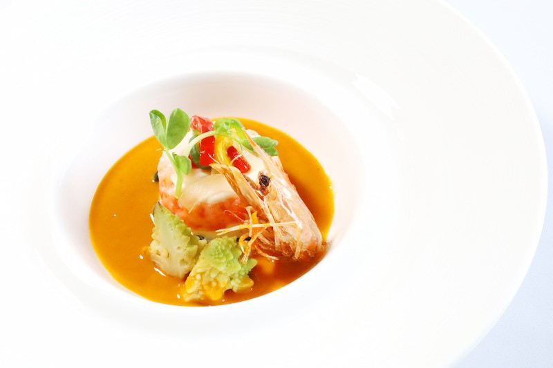 ・”幸えび”を巻いた海老と白身魚のムース サフラン風味の甲殻類クリームソース